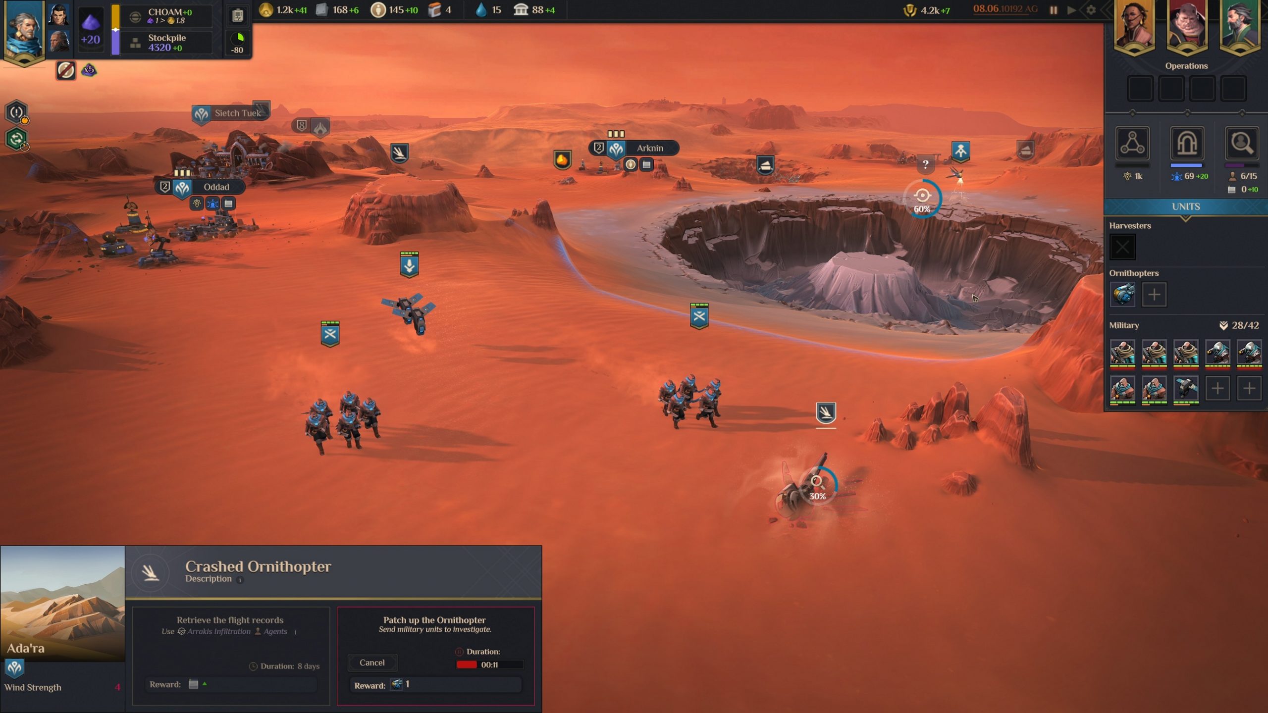 There’s a bit of base-building involved with the game, like any RTS (and resource management is going to be super important), but I loved how it handles those aspects. You can’t just build new stuff all willy-nilly. Instead, exploration will prove vital. You’ll have to venture out to find settlements and other discoveries with your trusty Ornithopter. Through this you’ll be able to find rich patches of Spice to harvest, neutral villages, ancient ruins, and much more.