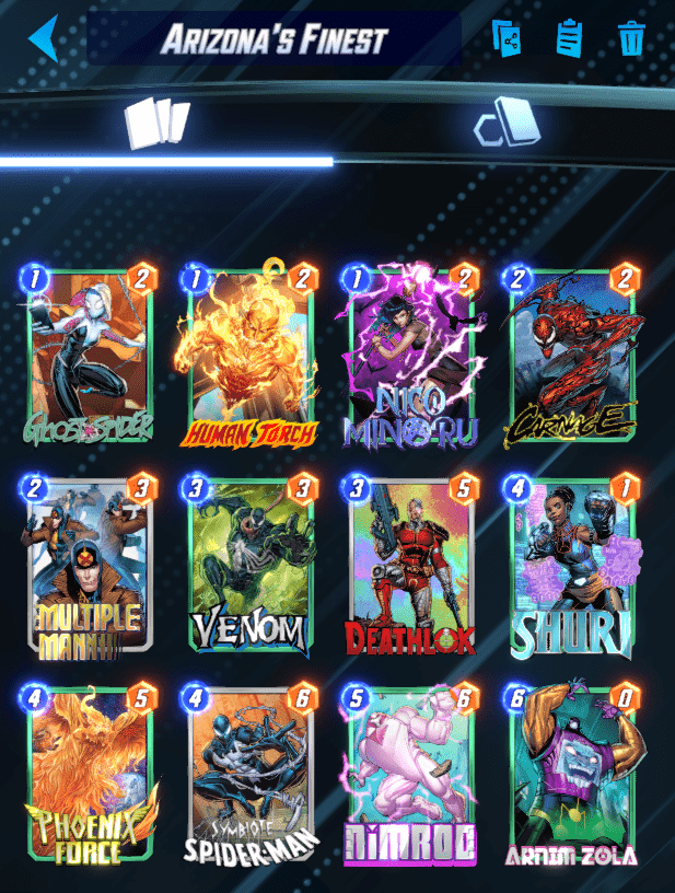 The Symbiote provides an additional back-up plan to the deck’s usual back-up plan of using Shuri, who doubles the power of the next card played at her location, to increase the power of Nimrod before spreading copies of it around each location using cards with the “destroy” keyword, allowing you to play SSM on turn 4, then play Nimrod on turn 5 before activating SSM, adding their power points together to double the Nimrod’s power additively instead of multiplicatively. This even opens up some cleaner play lines for the final turn of the game by only having one card in this lane instead of two, providing Arnim Zola’s card cloning effect only one target to choose from and guaranteeing two 12-power Symbiote Coated Nimrods on each of the other locations.