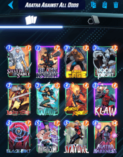 By filling your deck with mostly odd-numbered cards and including the three-card package of Lady Sif, Moon Knight, and Wave, you almost guarantee that you will be able to be rid of Agatha’s influence by turn four at the latest. Lady Sif always discards the highest-cost card in your hand, Moon Knight discards an even-numbered card from both player’s hands, and Wave reduces any card’s energy cost to 4 if it is higher. As a 6-cost card, Agatha will always be the highest-cost card in your hand and often the only even-numbered one. If not, Wave will ensure that when she takes the pilot’s seat again on turn four, she will play herself out. Combine this with cards like Black Knight, who creates a new 4-cost card with power equal to the first card discarded after he is played, and Ghost Rider, who returns a discarded card from the graveyard to his location, and you have access to one or even two powerful 14 cost cards with far fewer downsides than before.