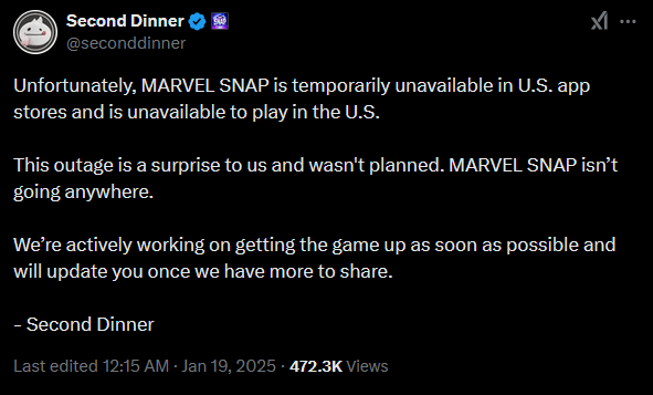 The news has apparently come as a shock to the Nuverse company, a subsidiary owned by ByteDance and the publisher of Marvel SNAP, as well as it’s California-based development team, Second Dinner. Second Dinner had this to say on their Twitter account within an hour of the news beginning to circulate: