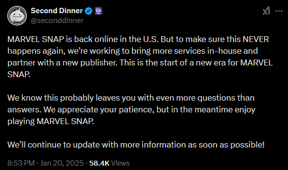 UPDATE: As of around 8PM CST, Marvel SNAP has been brought back online and is able to be played once again! Developer Second Dinner appears to have taken the confusion and anger surrounding this sudden outage to heart, posting on their Twitter that they are seeking a new publisher to avoid future concerns: