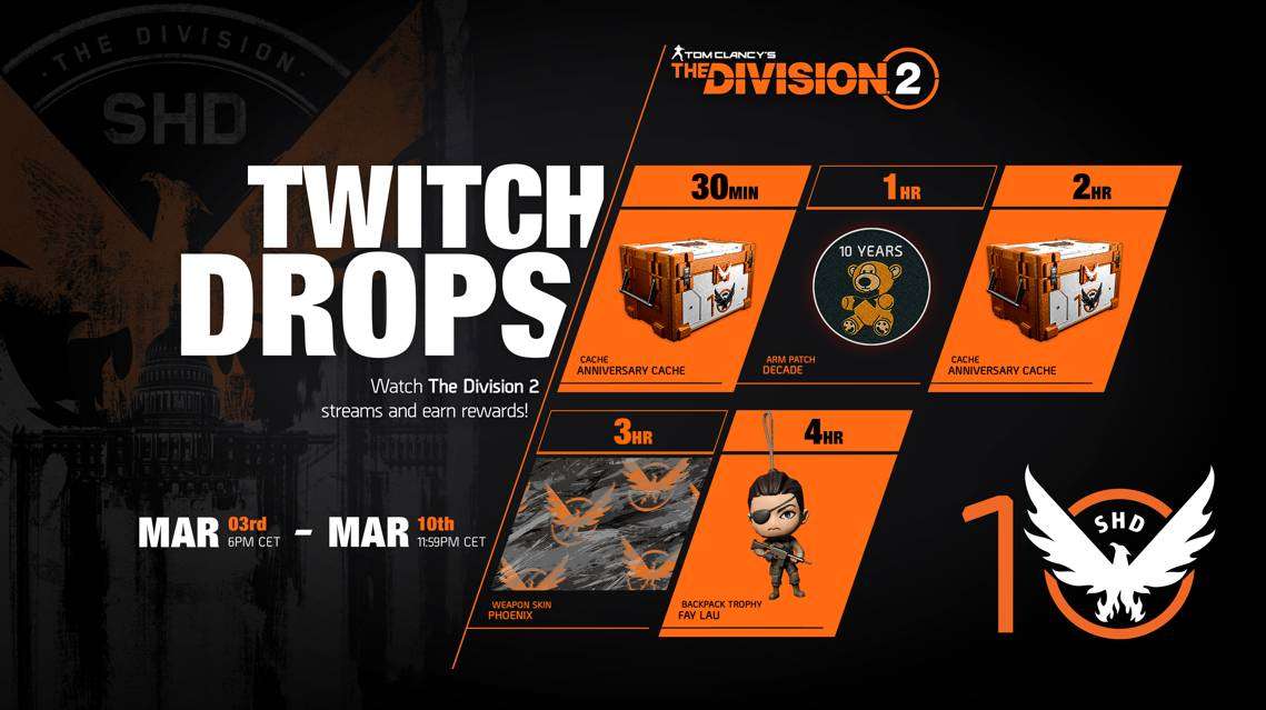 Twitch drops will be available to viewers who watch the stream live through March 10 at 3:59 PST/11:59 CET. Rewards will include Anniversary Caches, the Decade Arm Patch, The Pheonix Weapon Skin, and the Fay Lau backpack trophy.