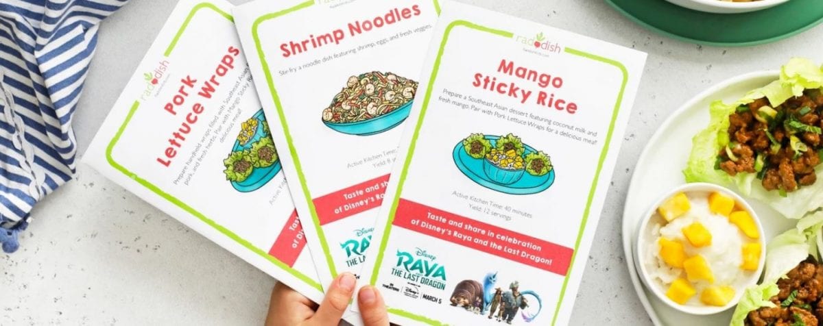 How does it work? Families can create their own “Dinner & a Movie” night with a free printable digital Raddish cooking kit that includes three Raya-inspired recipes: