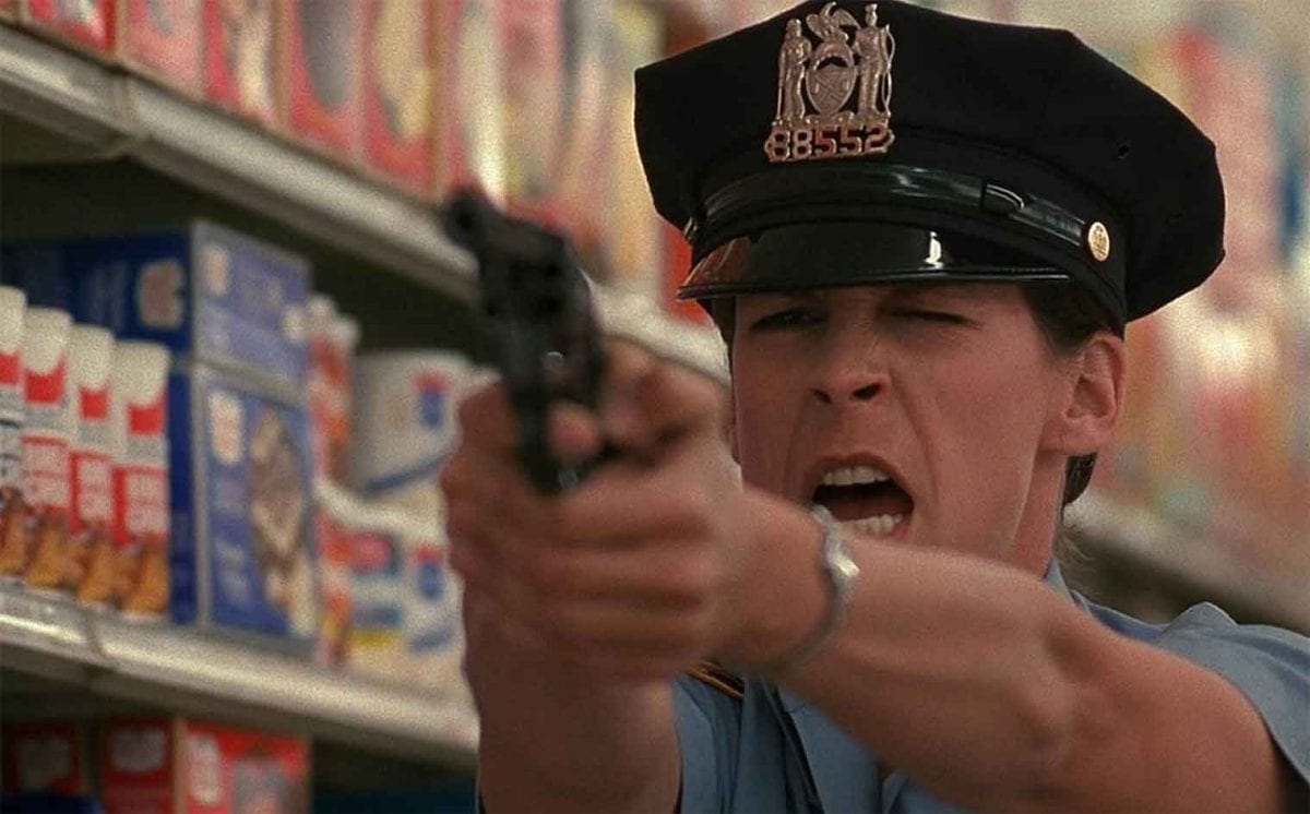 For instance, one of the ways Bigelow injects energy into her films is the way she frames or focuses on her characters. She often puts her characters in the midst of a lot of activity that is taking place both in the background and in the foreground. She then uses the camera’s lens to focus on the main character(s) while obscuring what is happening around them. This can be seen in the riot scenes in Detroit when she moves the camera along with a character in a crowd to help the audience identify with them. Or in an early scene in Blue Steel, Megan is walking along a very crowded sidewalk to her apartment. The camera’s focus is adjusted as she approaches, so that only she remains in focus while the blurs of other people walk by her.