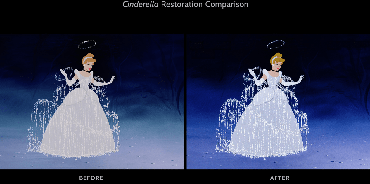 Goldberg, one of the all-time animation greats and veteran Disney directing animator, director and mentor to new generations of artists, added, “Working with Mike to restore this film was really a labor of love. We both really love the film, and felt strongly that we had to preserve it. Viewers watching this restoration will see more clarity, but they will also see more subtlety. They’ll see differences in color from shot to shot, and discover how one color works with another. Mike and I knew what the film was supposed to look like, and it took a lot just getting back to Cinderella having dusty blonde hair and a silver dress. I’m proud that the Studio felt it was important to get this restoration right, and trusted a handful of us to do that.”