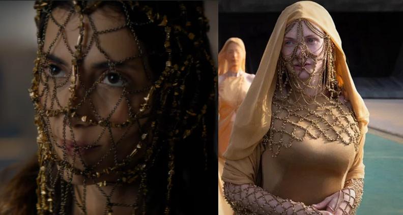 Wanderers of Harmonthep – Princess Ynez’s mother makes mention of the Wanderers of Harmonthep, a reference to the ancient Zensunni Wanderers who were the ancestors to the Fremen. Visually speaking, the headpiece she gives to Ynez when making the reference is similar to that worn by the Lady Jessica in Dune Part One.