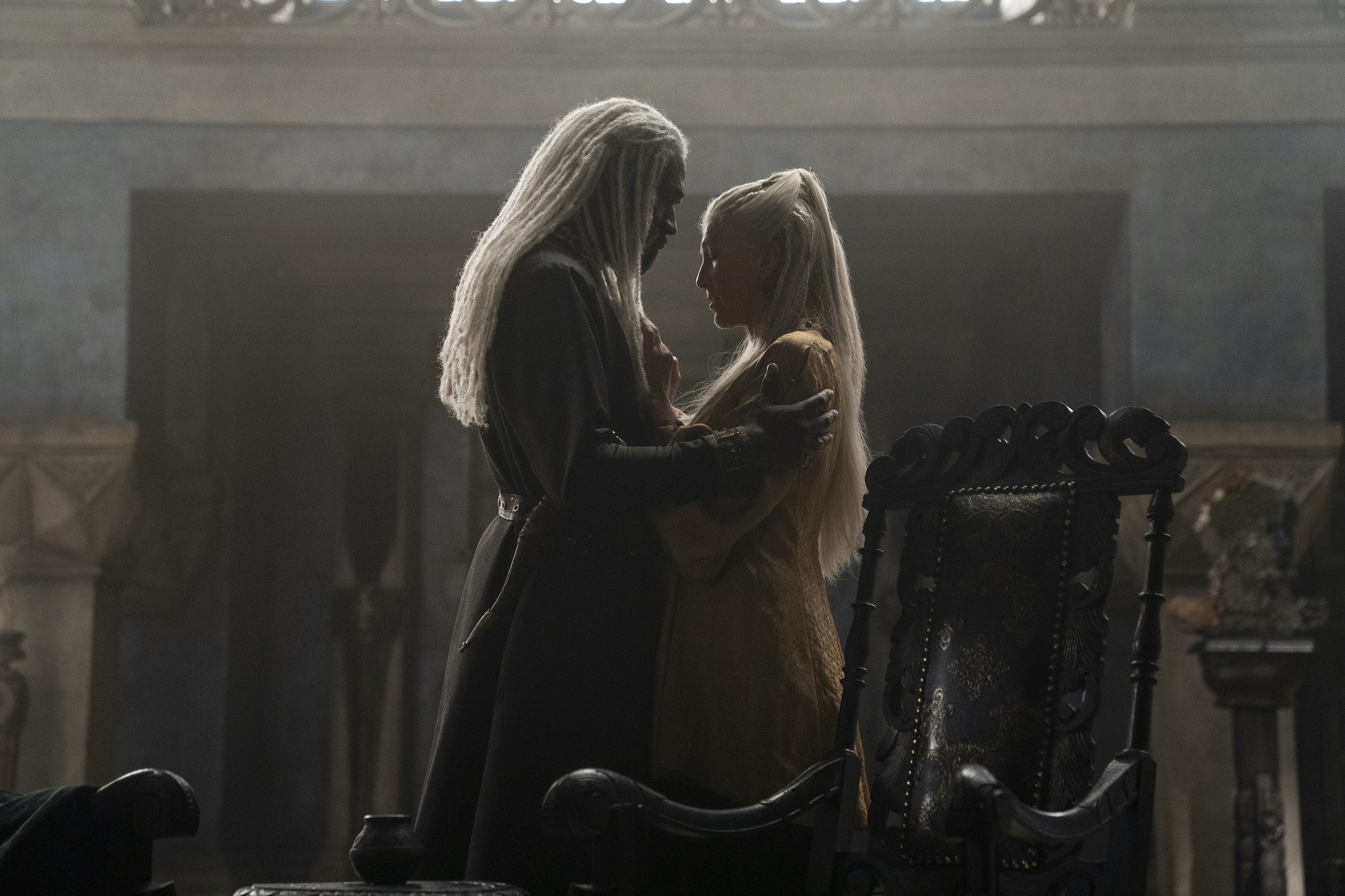 Eve Best as Princess Rhaenys Targaryen, a dragonrider and wife to Lord Corlys Velaryon, “The Queen Who Never Was” was passed over as heir to the throne at the Great Council because the realm favored her cousin, Viserys, simply for being male.