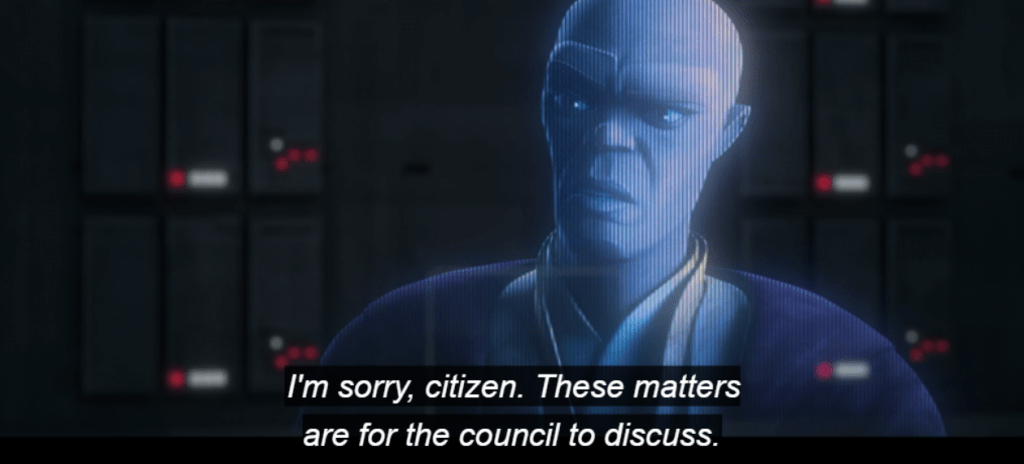 Even if it’s as innocuous as it seems, and Vernestra is genuinely only trying to keep the Jedi out of a scandal, it shows how the Jedi are losing their way. The lack of transparency shows their more insular nature, a shift from the “servants of the people” ideals they’re supposed to uphold. Jedi keeping secrets seems to be a running theme in this show so far…
