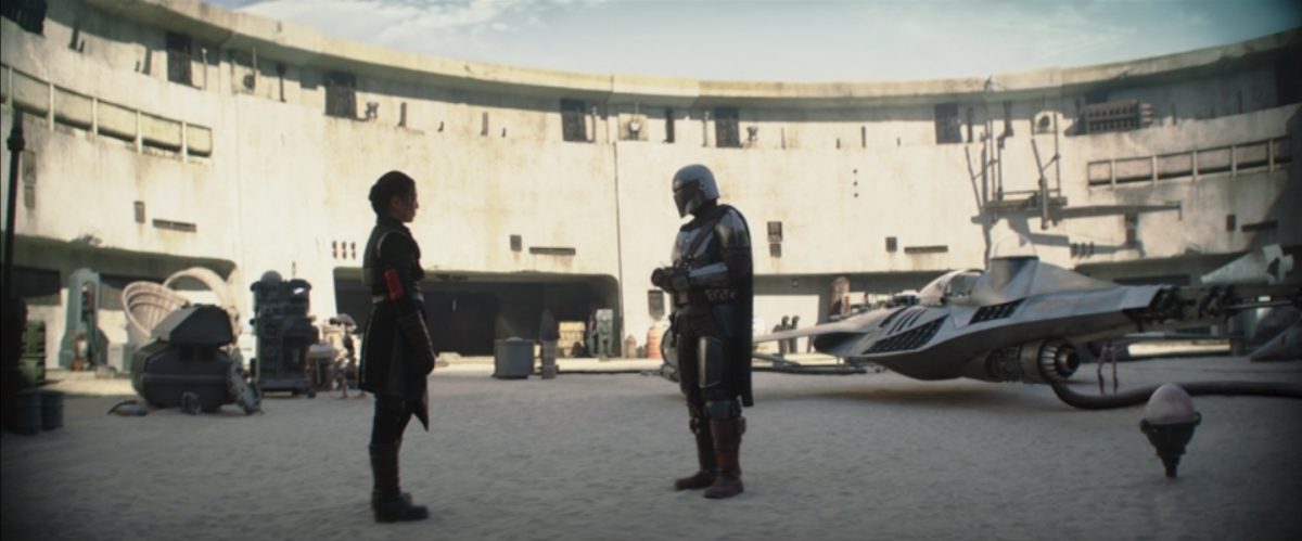 Once it’s up and running, Din takes it for a test flight that feels pulled straight out of the Prequels and showcased the enhancements they put into the old ship. After a fun conversation with some New Republic rangers, Din returns to Peli’s hangar, where none other than Fennec Shand is waiting for him.