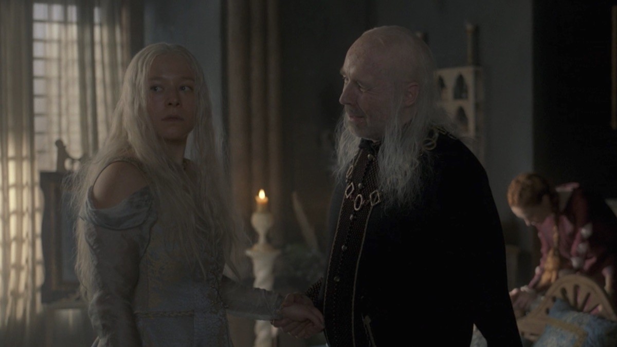 Regardless, we see others are playing the “game of thrones,” while Viserys himself remains disinterested. Instead, he remains focused on the one thing that truly matters to him: family. In that regard, the man is made of pure Valyrian steel, and even his most staunch manipulators dare not go against him in those moments.