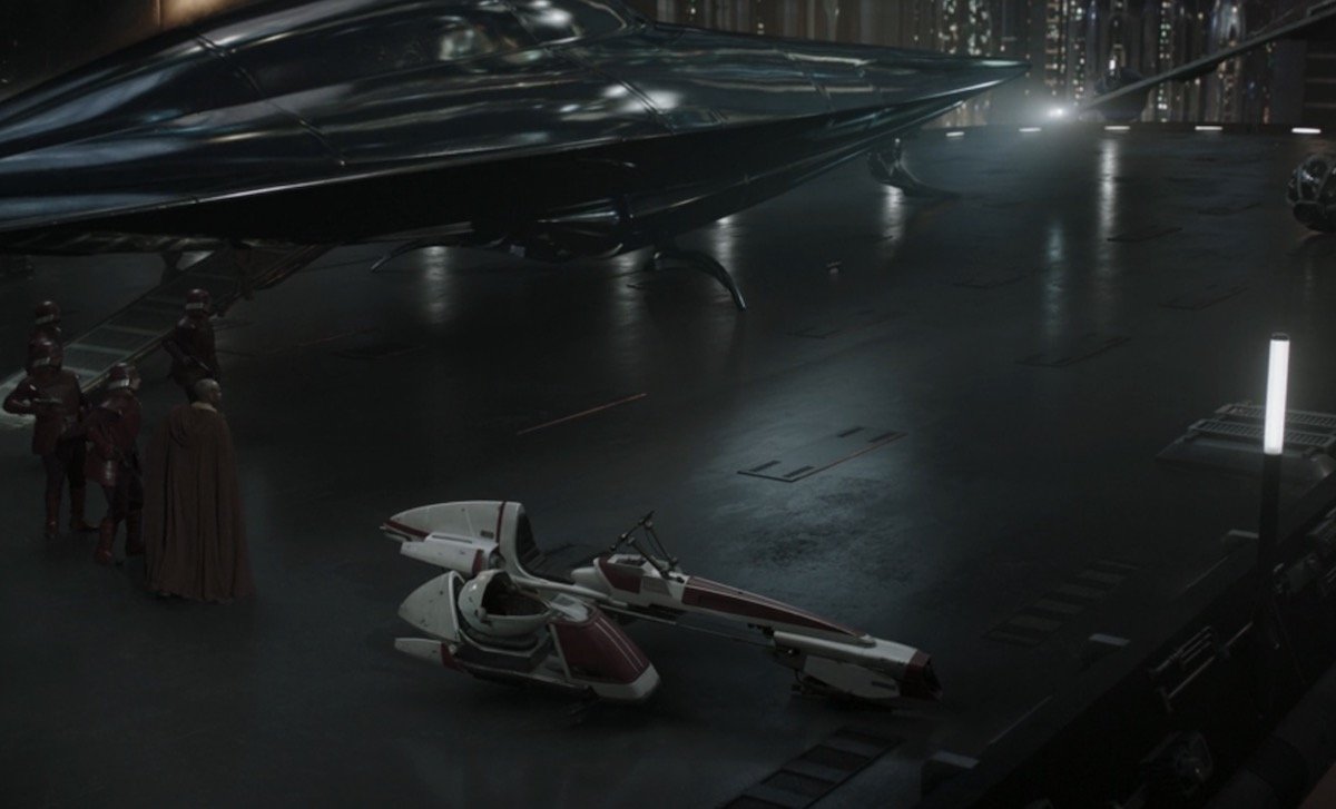 Anyway, Kelleran manages to escape the Temple with Grogu in tow. After a quick chase through Coruscant, Kelleran mentions having “friends” waiting…Which turns out to be some helpful Naboo guards standing by with what appears to be an H-Type Nubian Yacht (which is what Anakin and Padmé used in Attack of the Clones).