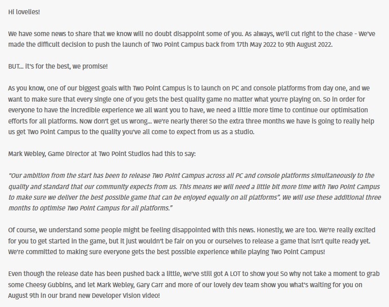 “Our ambition from the start has been to release Two Point Campus across all PC and console platforms simultaneously to the quality and standard that our community expects from us. This means we will need a little bit more time with Two Point Campus to make sure we deliver the best possible game that can be enjoyed equally on all platforms”, said Mark Webley, Game Director at Two Point Studios. “We will use these additional three months to optimize Two Point Campus for all platforms.