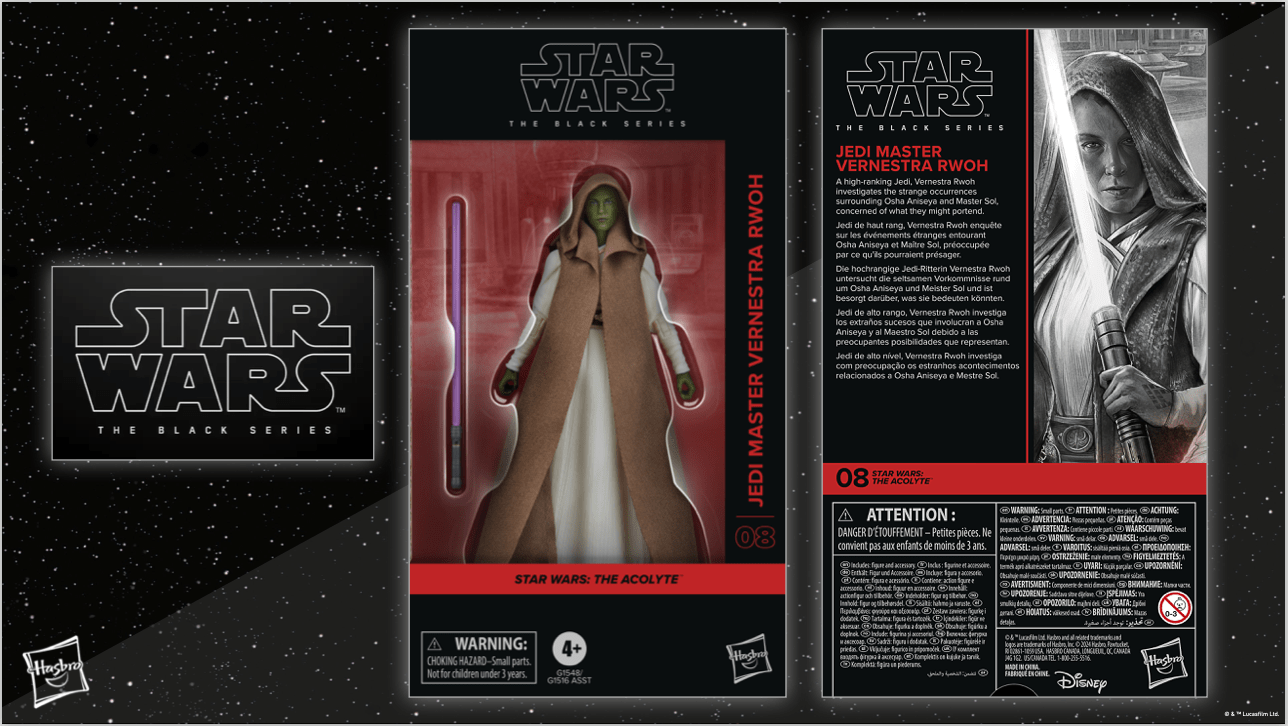 A high-ranking Jedi, Vernestra Rwoh investigates the strange occurrences surrounding Osha Aniseya and Master Sol, concerned of what they might portend. STAR WARS: THE BLACK SERIES includes 6-inch action figures, vehicles, and roleplay items from the 40-plus-year legacy of the STAR WARS galaxy, letting fans create galactic scenes with a faithfulness to STAR WARS comic books, movies, and series. This STAR WARS action figure is detailed to look like Jedi Master Vernestra Rwoh from the STAR WARS: THE ACOLYTE live-action series on Disney+. Display STAR WARS fandom on your shelf with window box packaging featuring sleek character design. Features a soft goods robe and comes with a Lightsaberâ„¢ accessory.
