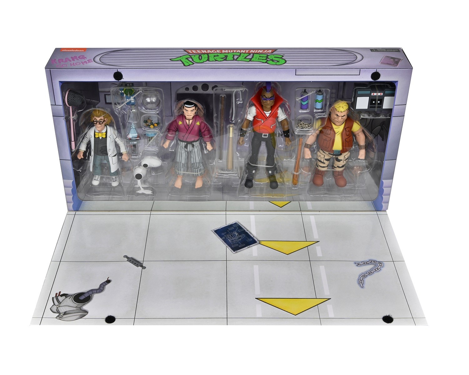 The “Pre-Mutation” pack brings together Bebop and Rocksteady, Hamato Yoshi, and Baxter Stockman (marking the debut for this figure), in their human forms with a whole bunch of accessories to go with it.
