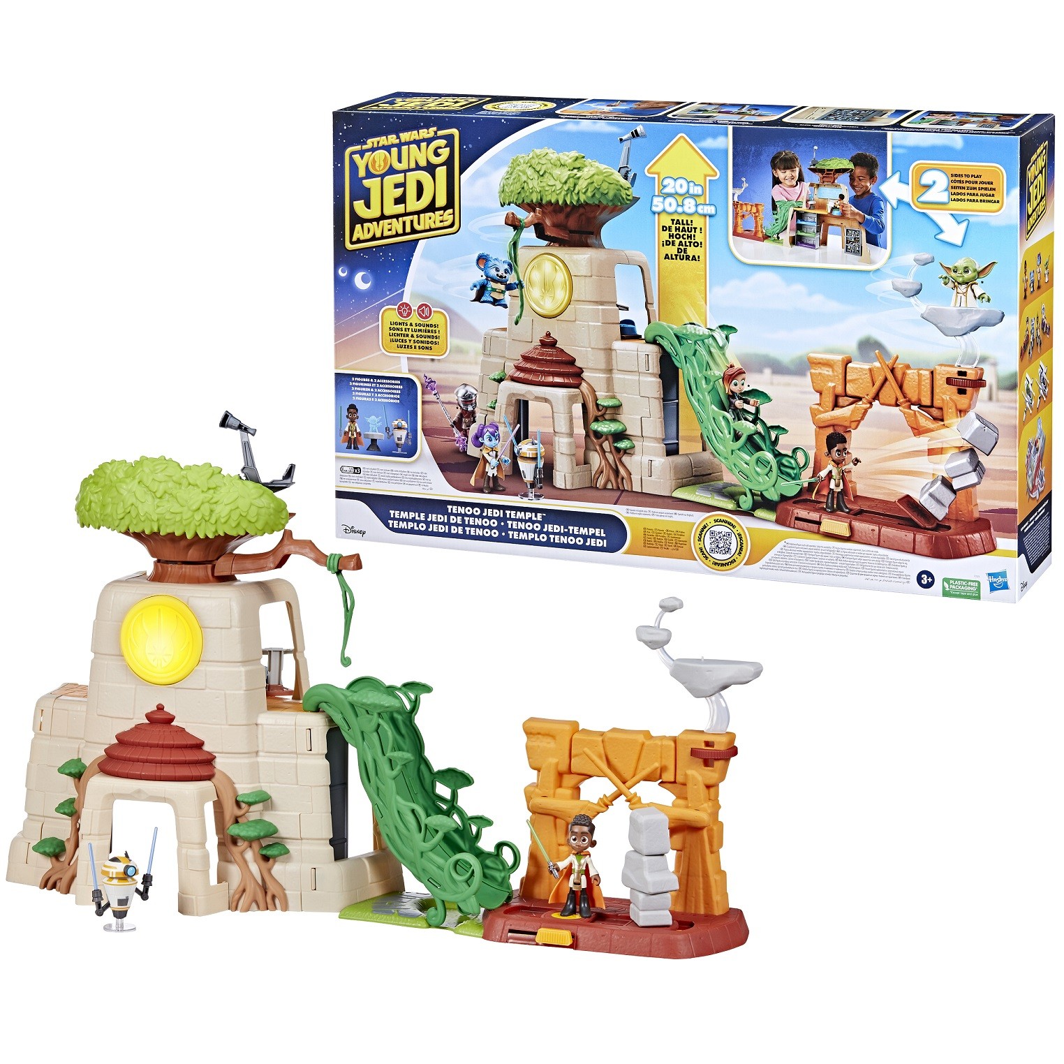 Bring playtime to a galaxy far, far away with the STAR WARS: TENOO JEDI TEMPLE PLAYSET inspired by the action-packed YOUNG JEDI ADVENTURES animated series on Disney+. Kids ages 3 and up will love exploring all the features this playset has to offer, like a swinging vine, a classroom area, a vine slide, sleeping quarters, “floating” rocks, and Force push panels where Jedi in training can practice their skills. The set features lights and sounds, plus two 4-inch-scale figures (Kai Brightstar and a training droid), a Lightsaber accessory, a hologram Yoda accessory and 3 stone accessories. Includes temple playset, 2 figures, and 5 entertainment-inspired accessories.
