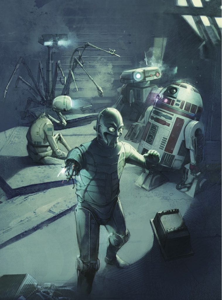 I’m a sentience/droid nut so the second tale, An Old Hope is right up my alley as we follow a lost and scared astromech droid named LA-R1 on Tatooine. And we know that anything not tied down on the planet furthest from the bright center of the universe gets scooped up by Jawa’s in pretty quick fashion, either to be employed in some gruesome fashion or sold for parts. For our hero LA-R1, he was kidnapped and thrown in with an equally desperate lot of fellow restraining bolt’ers onboard a sandcrawler. Once the twin suns set and their captors turn in for the night however, the droids have a chance to swap stories of longing, heartbreak, and desperation, each with a sad tale to tell.