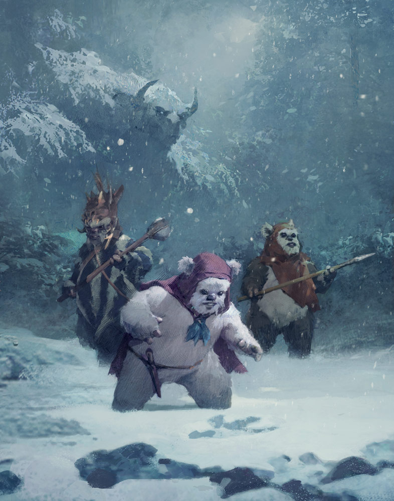 “I couldn’t see my spear in front of my face.” , uttered by Weechee, Wicket’s older brother, is perhaps one of the cleverest and well-intentioned bits of figurative language in a Star Wars book as it’s both fantastically absurd given the context, and obviously grounded in reality at the same time. It’s a Star Wars idiom for god’s sake! What it also does is speak to the type of language Scott and Mann give the Ewoks who, for our benefit, are speaking basic, not Ewokese.