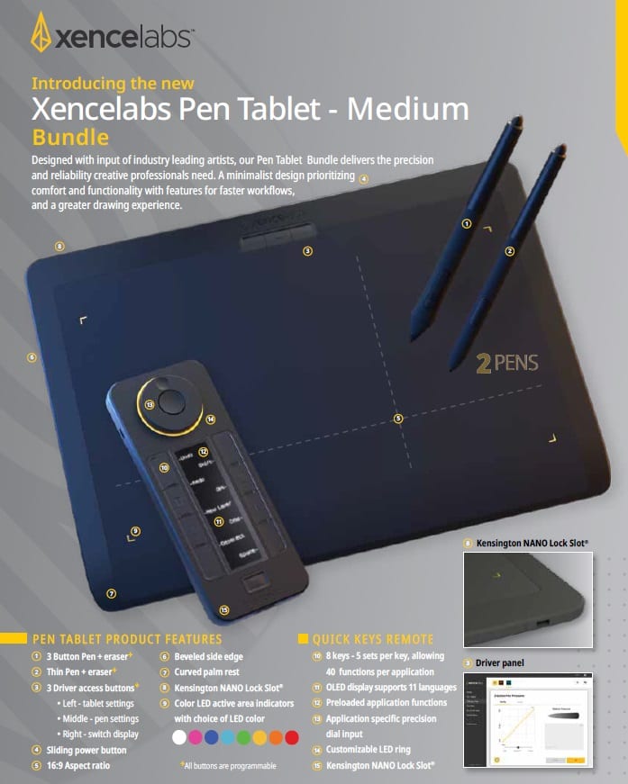 Xencelabs products are available in different configurations: Pen Tablet Medium and the Pen Tablet Medium Bundle with a Quick Keys™ remote option. The Quick Keys™ enables artists to incorporate shortcut keys into their regular workflow through an easy-to-use interface. Both product configurations come with two different sized pens. Additionally, a range of accessories are available for purchase separately.