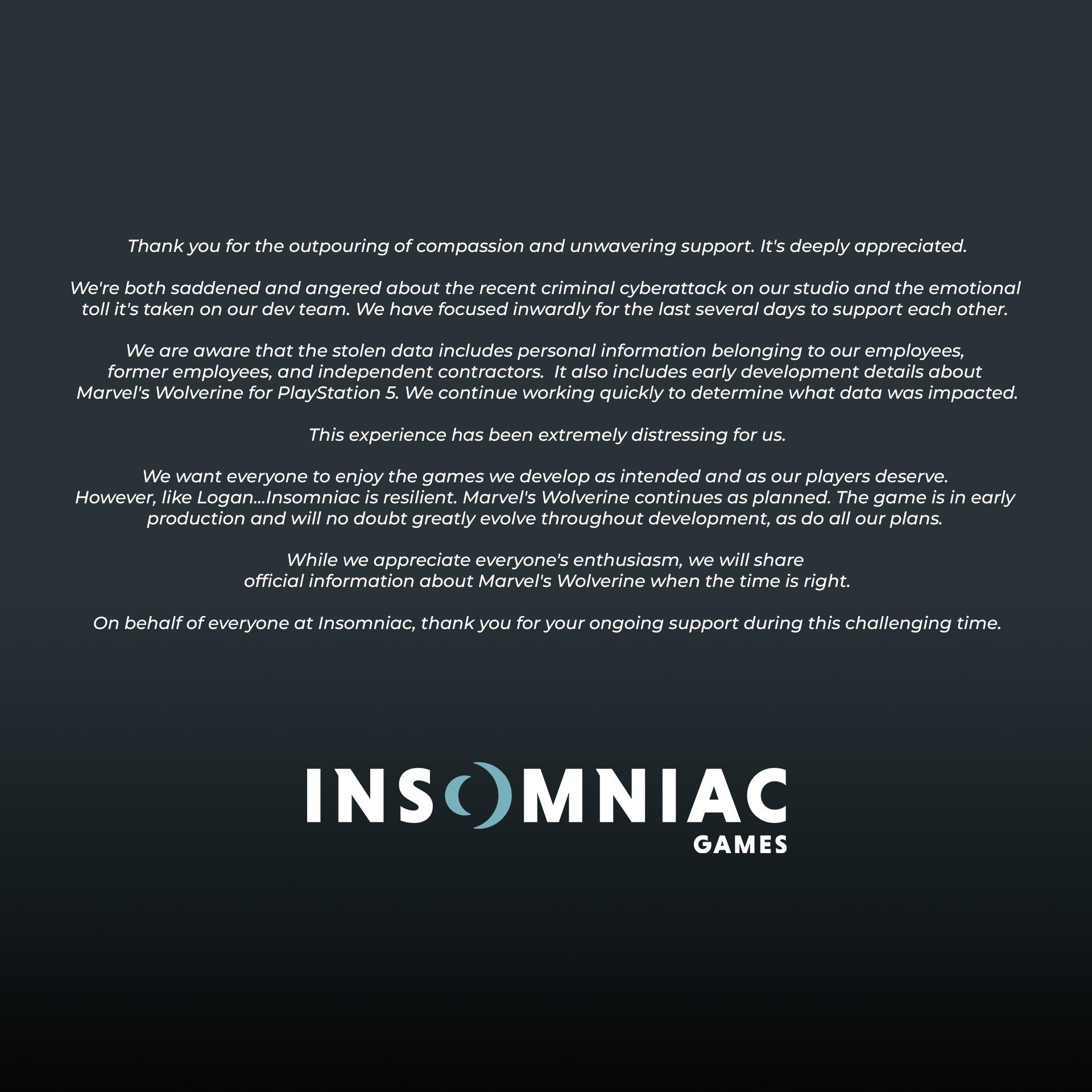 The developers at Insomniac have formally addressed the hack on their studio, while confirming work on Marvel’s Wolverine is going forward as planned.