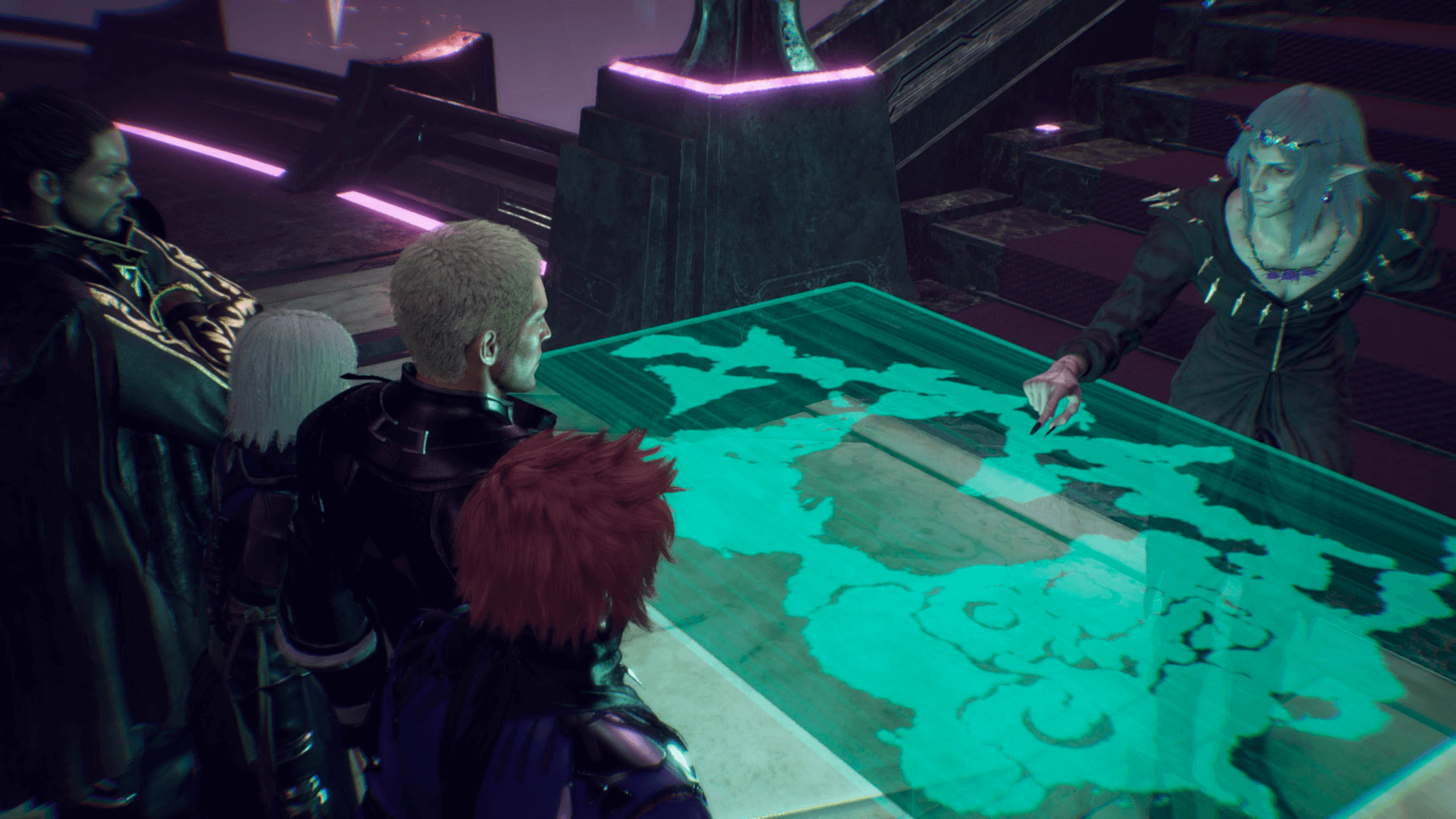Astos, the king of the dark elves, awaits the group in the Western Keep. He shows them a futuristic-looking map, appearing to be giving some kind of advice.
